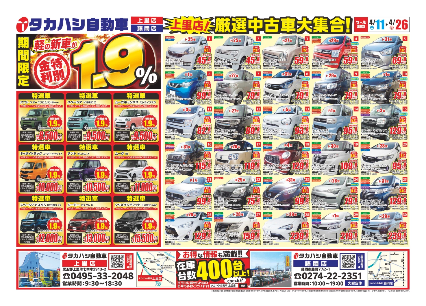 タカハシ自動車では、即納可能な在庫車を400台以上取り揃えています。